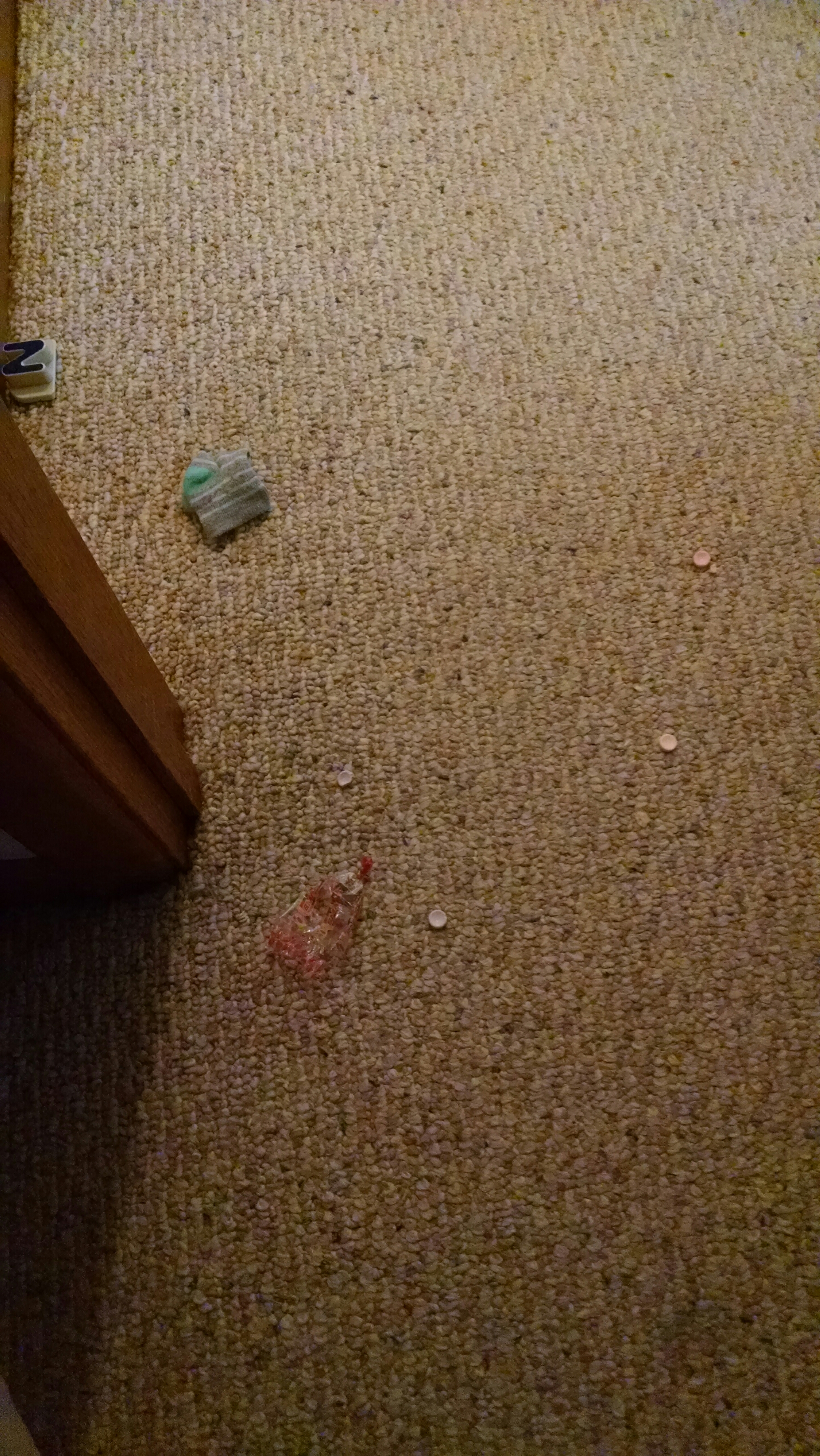 Speaking of Claire… I asked her to pick up the candy, sock and toy she threw on the floor. It appears she decided not to.