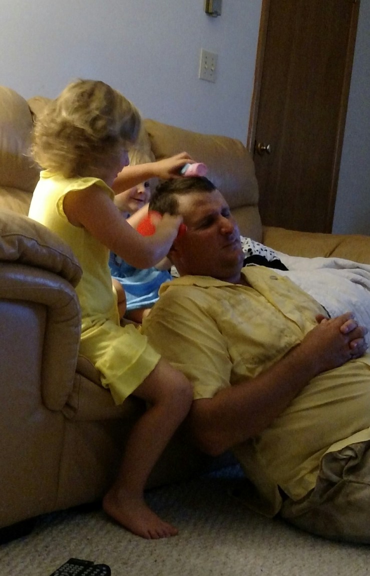 Then right before bed they decide to play “beauty salon” and Lynn is their mannequin . They are not gentle. They pretend primp and pretend curl and smack him on the head with the brush trying to brush his hair.