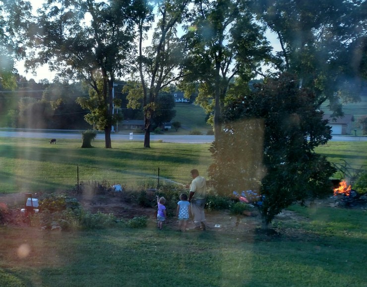 I took this photo out of the bathroom window. It’s Lynn burning trash and watering the garden…sometimes squirting the girls with the water hose. The shrieks are what made me look out. (Also notice the mini donkey in the background -he belongs to the neighbors and is rarely where he is supposed to be)