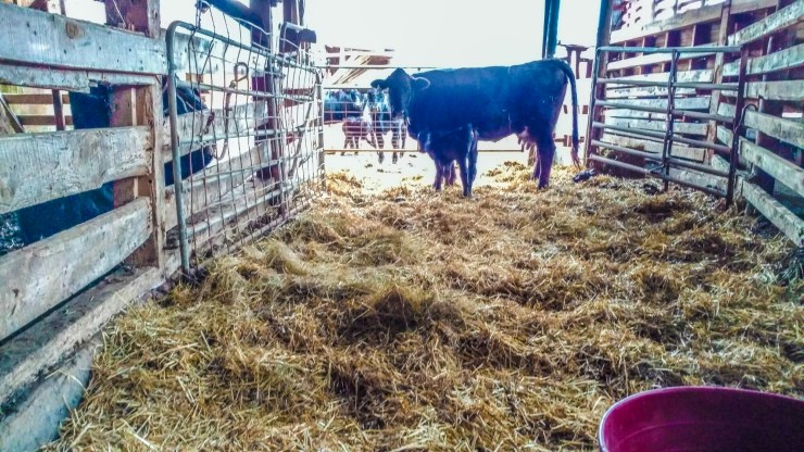 This cow had her bull-calf on the edge of the creek. When it was born, it slid down the bank into the creek. Luckily they were able to get it out before it suffered any ill effects. Mama cow and calf didn’t figure out nursing right away so Lynn put her in the nice dry barn so he could check on their progress.