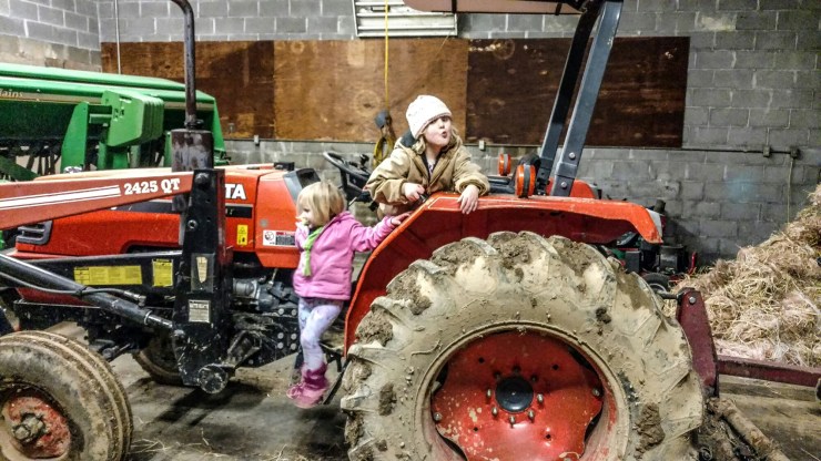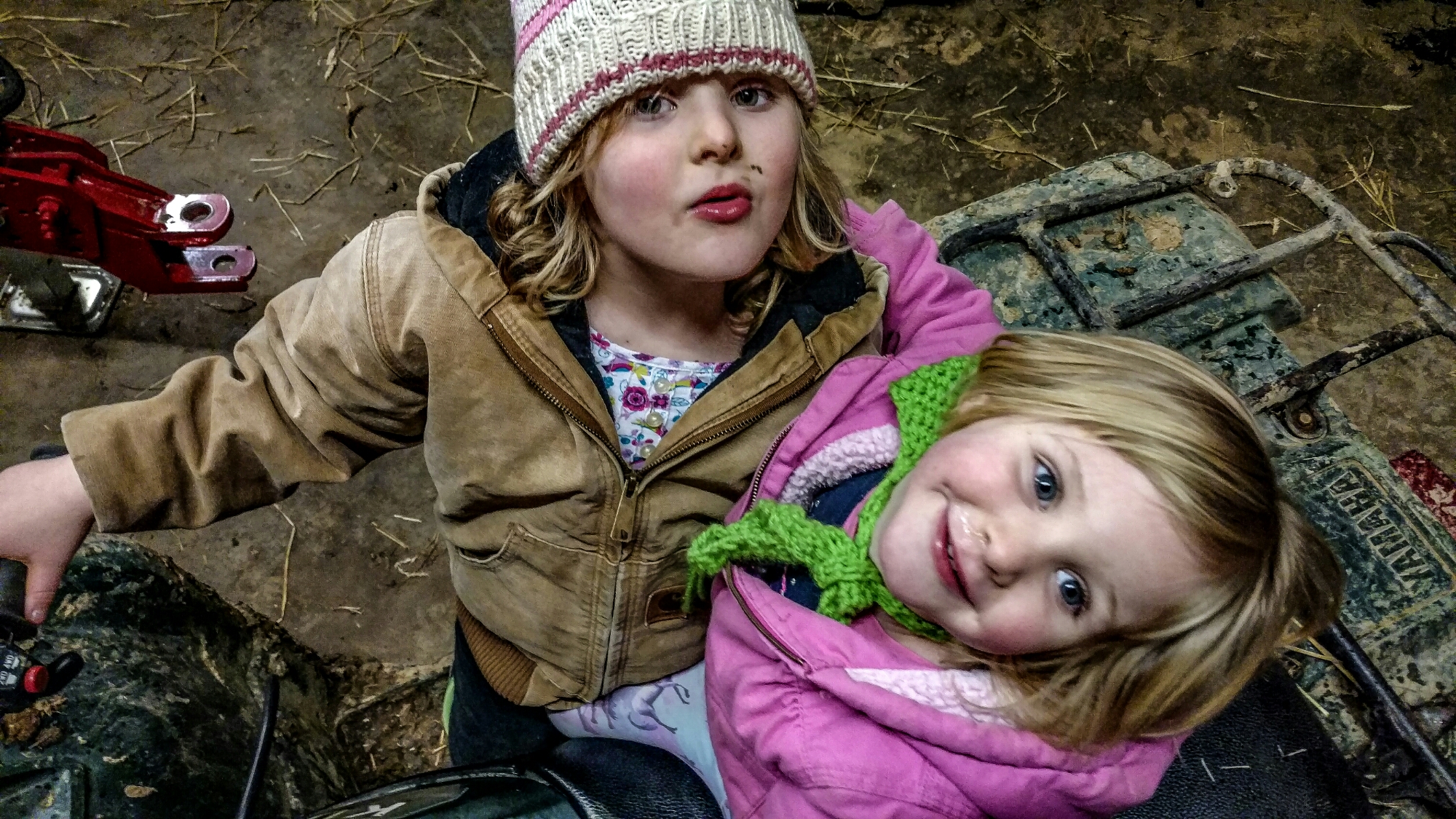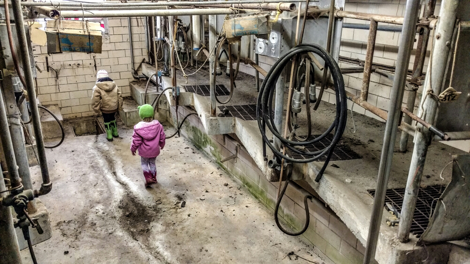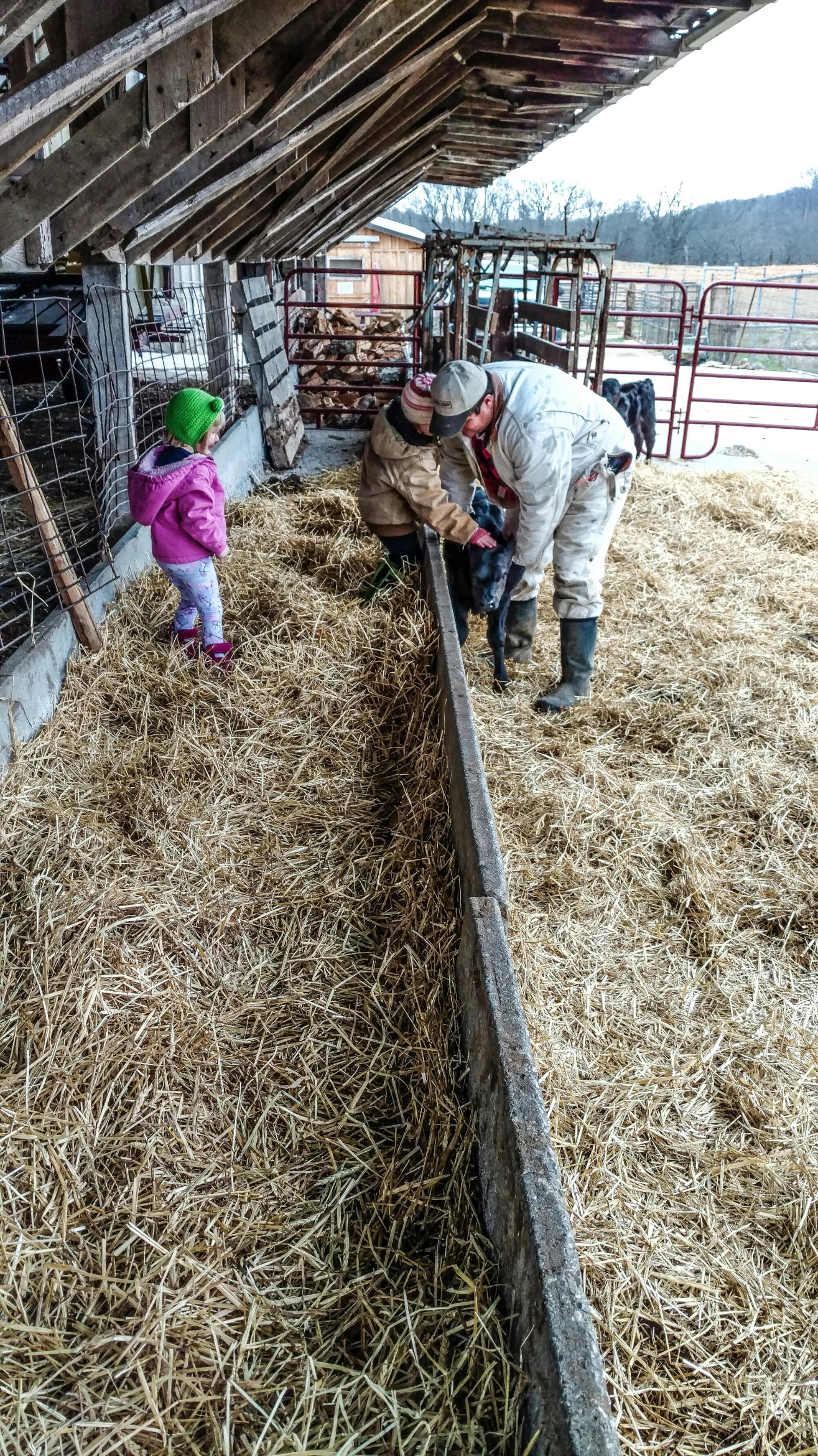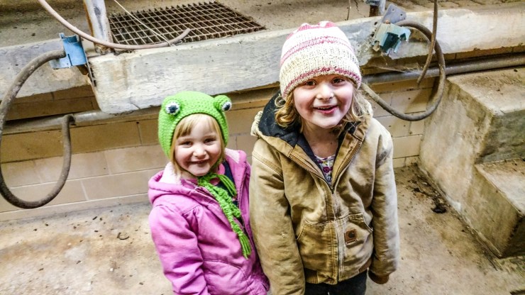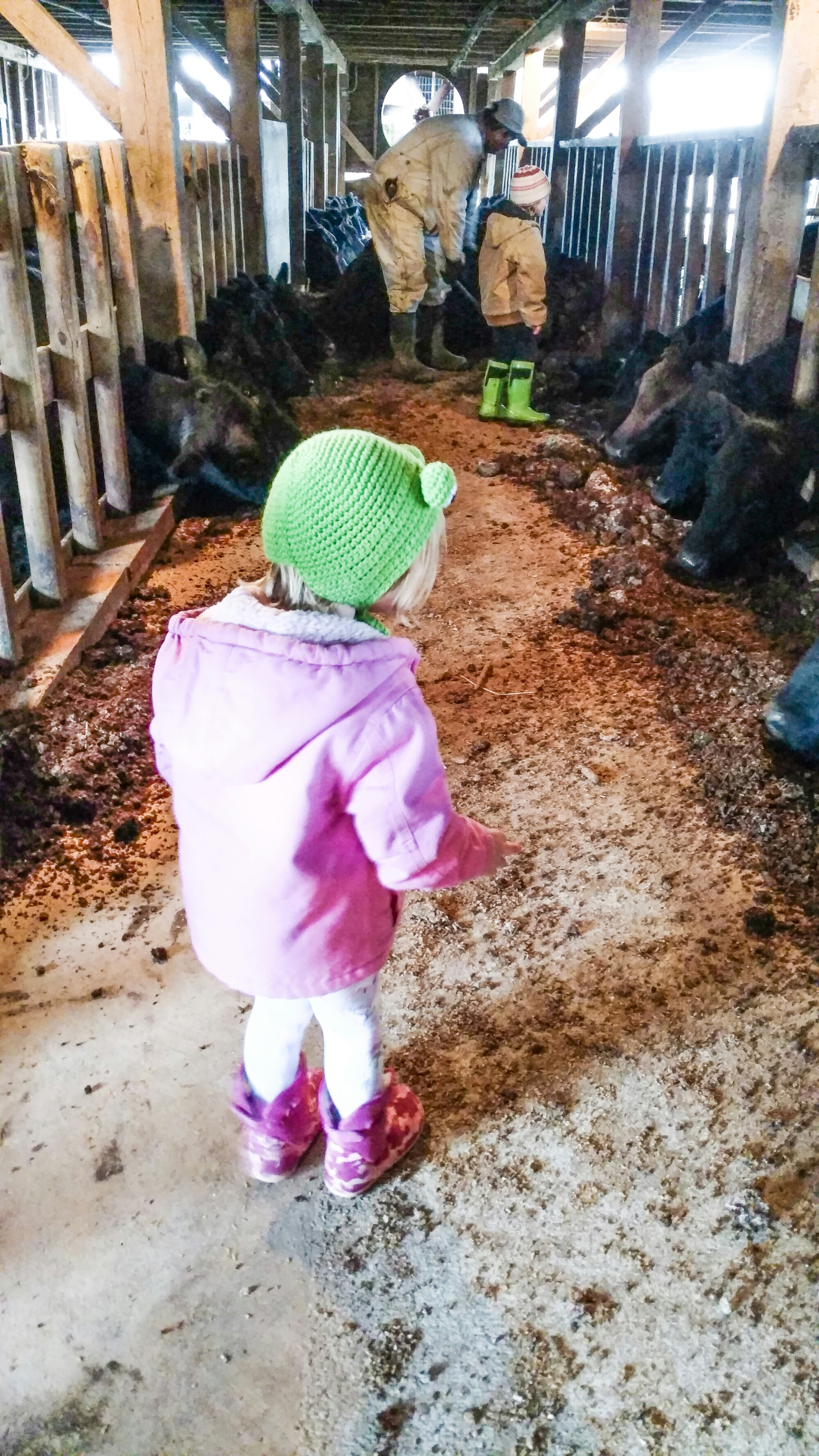 Lynn went to go check on two heifers that did not come in. They had brand new babies this morning, and he have them a little vitamin/mineral mix in their mouth. Since it was spitting snow and very windy the girls and I found shelter in the old milk parlor and the shop
