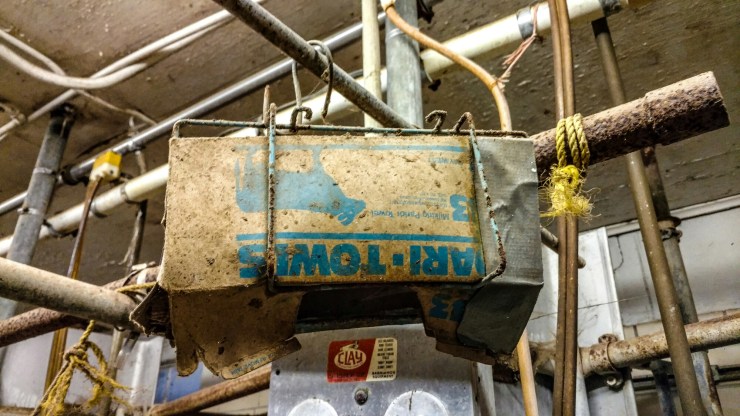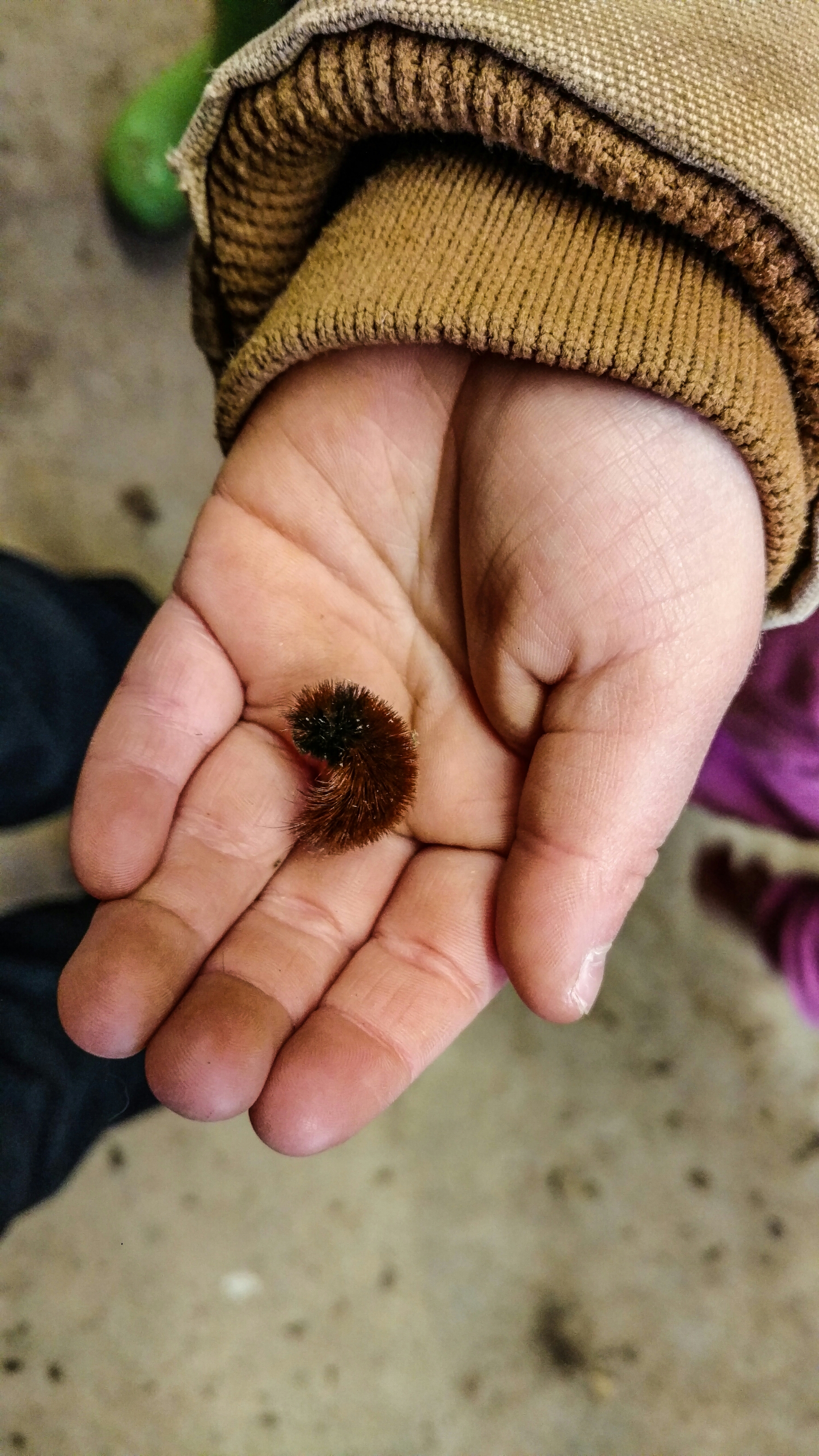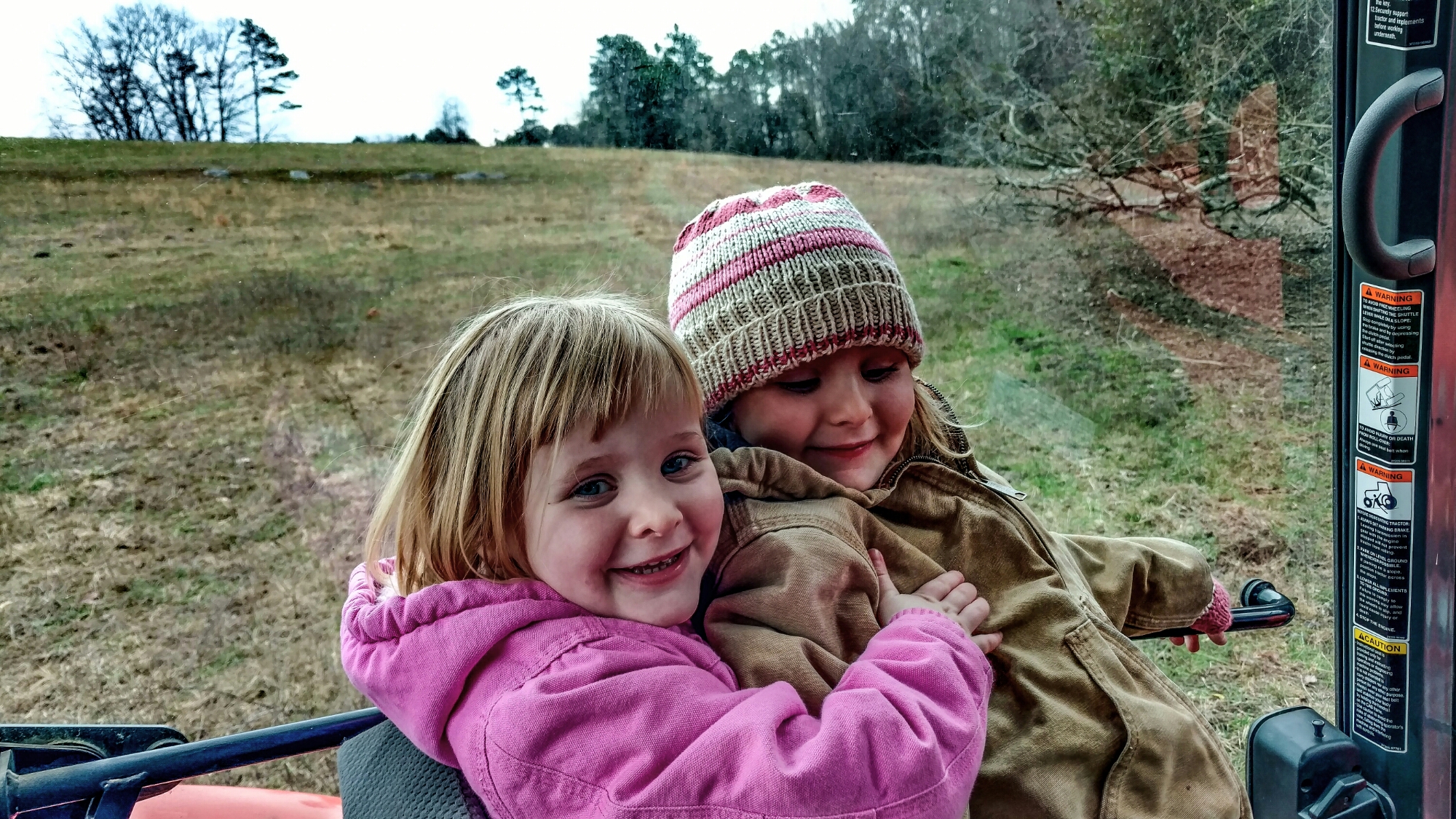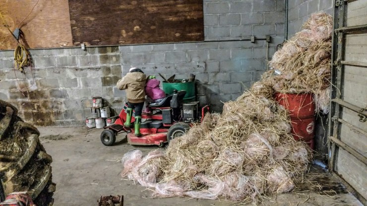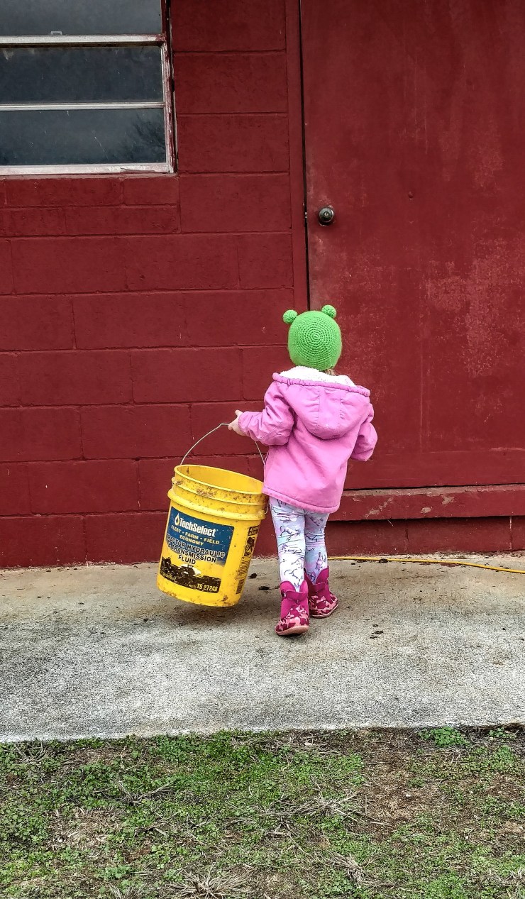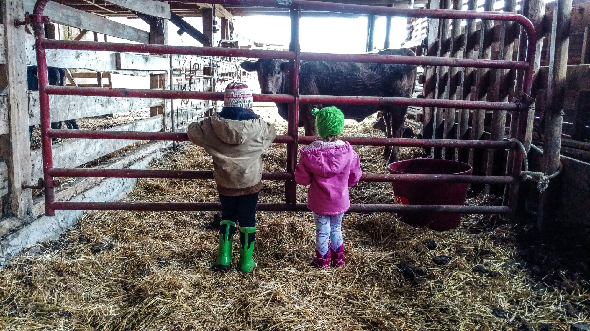 Lynn went to go check on two heifers that did not come in. They had brand new babies this morning, and he have them a little vitamin/mineral mix in their mouth. Since it was spitting snow and very windy the girls and I found shelter in the old milk parlor and the shop