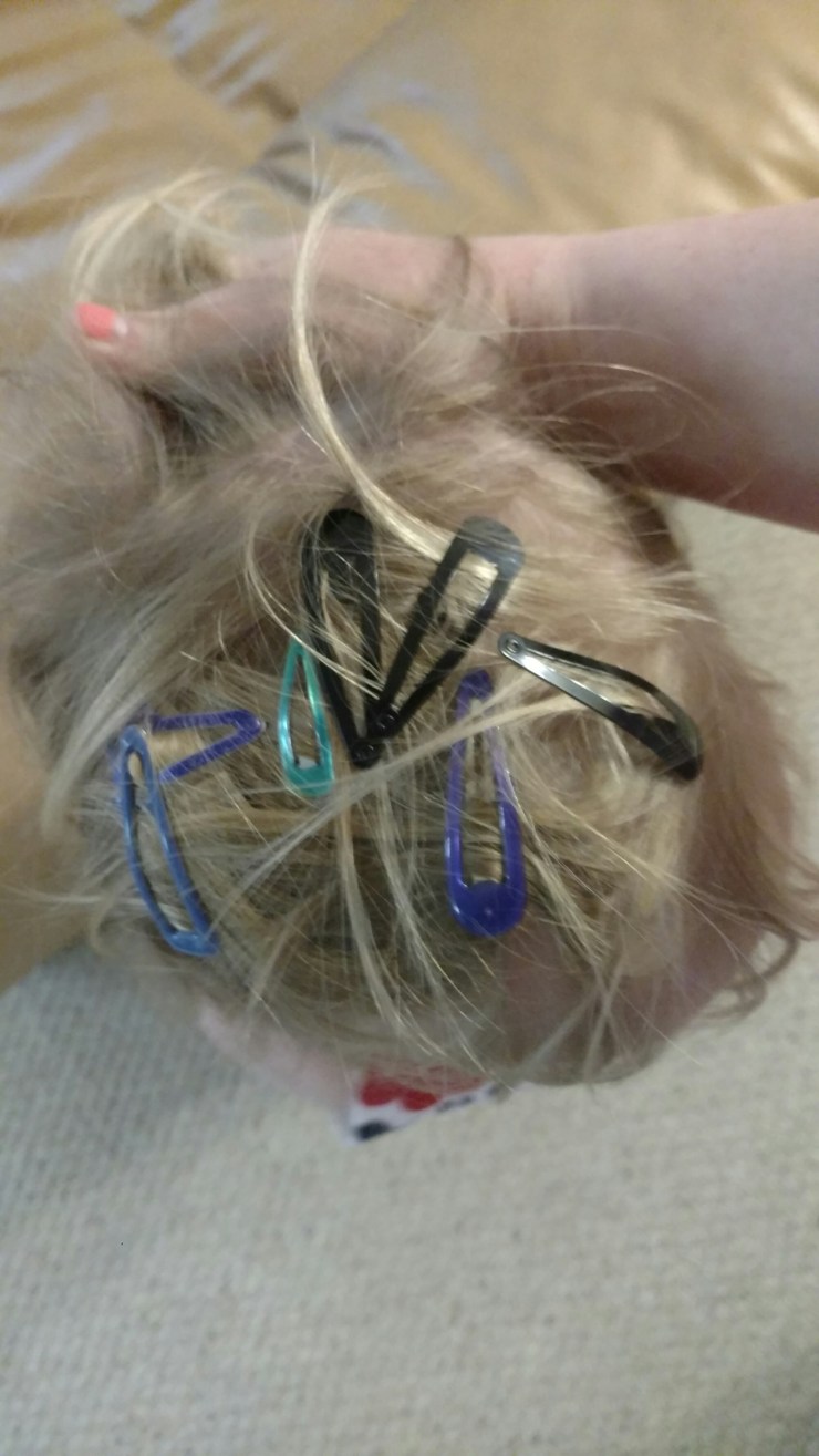 I passed Claire in the hallway. WEARING A COMPLETELY DIFFERENT OUTFIT. And like 10 hair clips which she screamed bloody murder when I tried to remove a few. So I left them in.