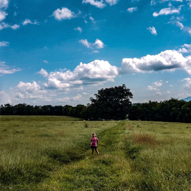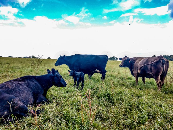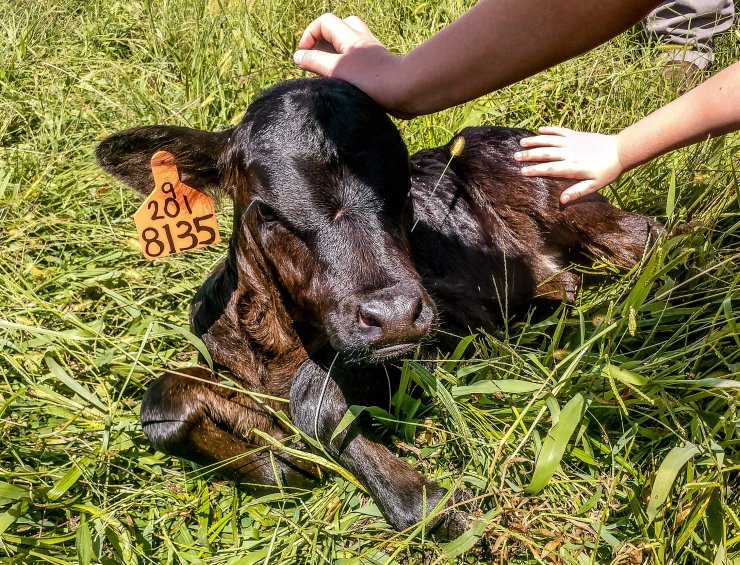 The calves are still being born. This calf is a day old here, it was hidden in the grass with Mama cow closely monitoring. The girls gently petted it a couple times, which made their day. They are so soft when they are new.