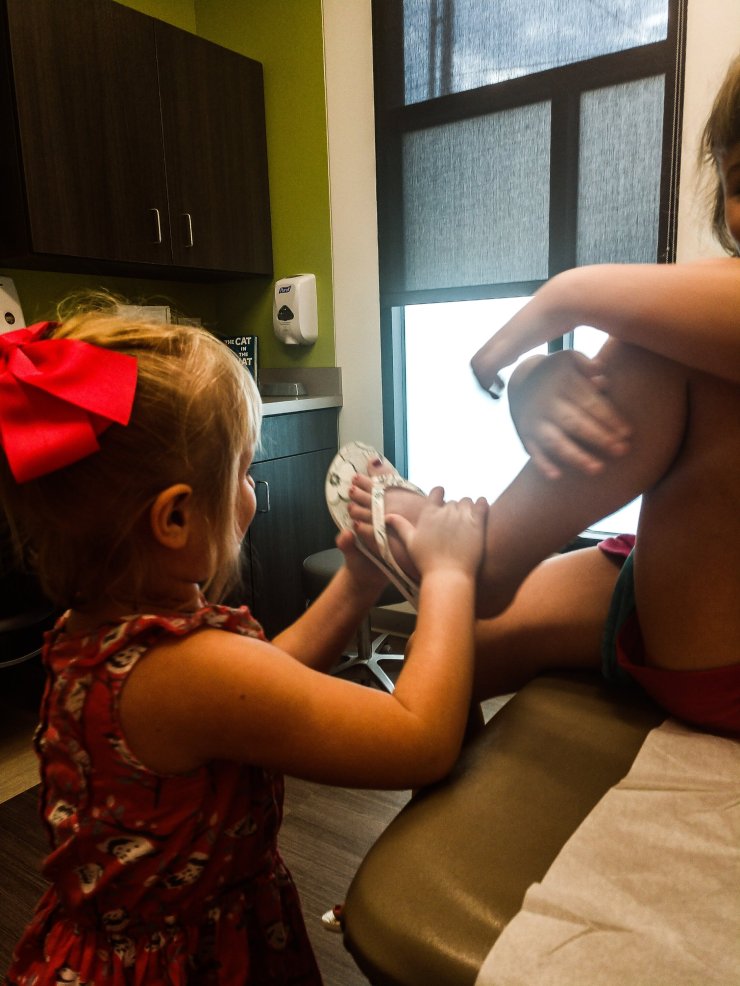 Dang it. Since Lynn is neck deep in corn harvest he’s not able to help by hanging out with Claire. Two kids at the doctor are quite a challenge.