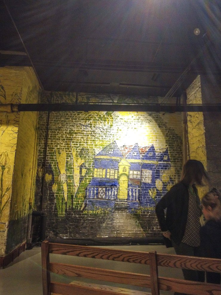 One of the girls favorite exhibits was the historical posters of the dairy barn. The dairy is now a winery and we walked around the entrance and the underground storage.