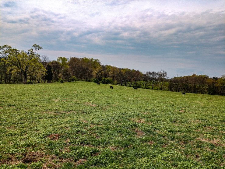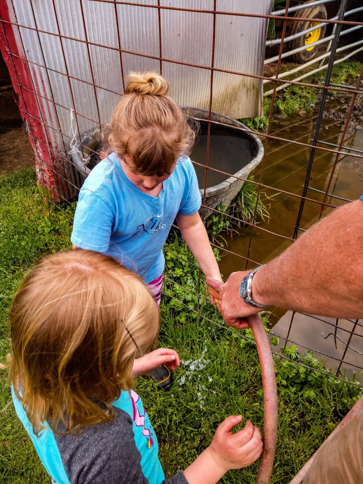 All the GREEN! Spring is FINALLY here, and it seems that the world has sprung to life again.This down tree made an excellent balance beam for the kids while we waited on Lynn.See the milk “mustache” on this big calf? Spring grass increases milk production in the Mama cows. If I remember his tag number correctly he’s between 6-7 months old. Lynn could tell you the exact day of his birthday I’m sure.Caroline opted to walk between the last two gates.Rinsing mud off before hopping back in the truck.This rented farm I think is so pretty.
