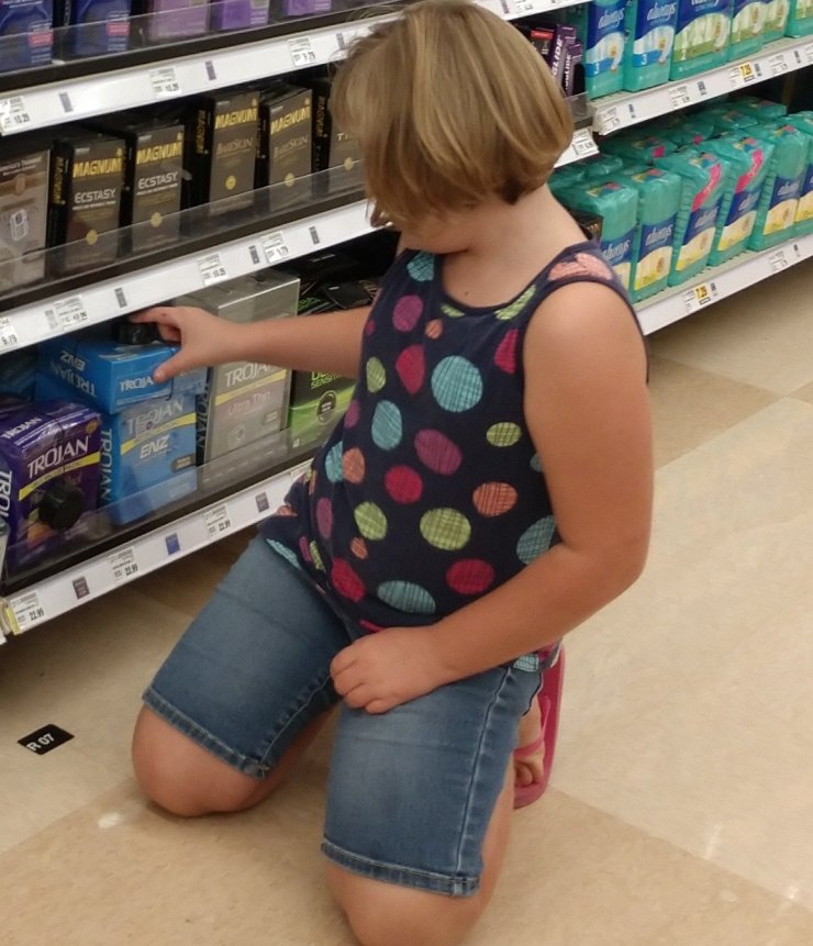 I look over and it’s Caroline on the other side of the aisle. Holding the biggest ECONOMY BOX OF TROJAN CONDOMS there is to be had at the Kroger.