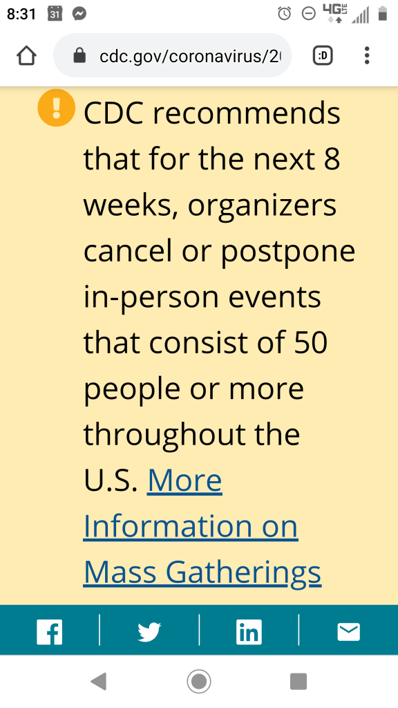 We can’t control the virus outside our actions and home. We can’t force people not to hoard great amounts of toilet paper or whatever. (I’m talking beyond getting supplies for your household) As I type this the CDC has reccomended that any gathering over 50 people be cancelled.